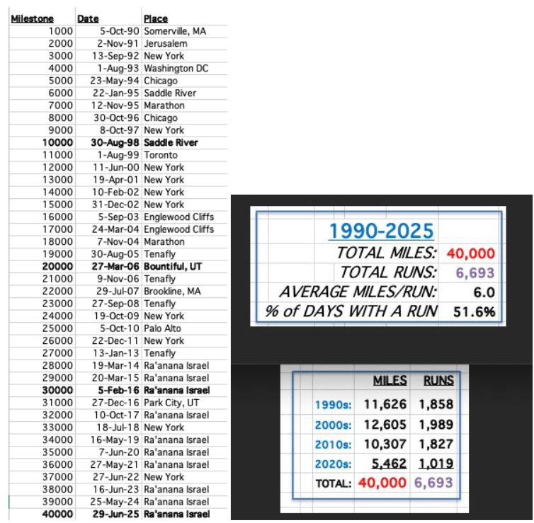 I hit 10,000 on August 30, 1998, in my hometown of Saddle River, NJ. Then I passed 20,000 on March 27, 2006, during a long training run in Bountiful, Utah. And 30,000 on February 5, 2016, right here in Ra’anana, Israel.